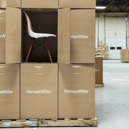 2-й кадр Берем наши большие коробки, ставим их на паллеты 9 коробок в три ряда, в одной из открытых коробок в центре, стоит кальян. На заднем плане виден склад, красивый склад.